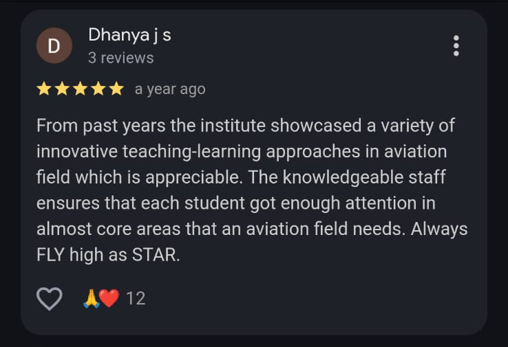 At Flystar Aviation Academy, we train future aviation professionals to achieve their dreams of flying high. We provide professional aviation courses with hands-on training, expert mentorship, and real-world industry exposure which positions us as the best aviation institute in Trivandrum. If you are looking forward to working as a cabin crew, airport manager, ground staff, or logistics expert Flystar Aviation Academy is the right place to acquire the right skills. We ensure you gain the skills, confidence, and industry know-how to excel in a competitive global market.